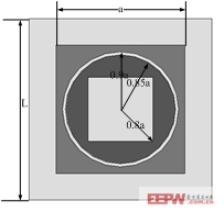 图2给出了新型微带反射阵单元的结构图。该单元工作的中心频率为12GHz,微带贴片置于边长为17mm(约为0.68)的方形介质板中心。介质板的相对 介电常数2.65、厚度为0.79mm,且与地板之间有3mm的空气层。介质板上层的贴片单元具体结构如图2(b)所示,其尺寸相对大小在图中给出。