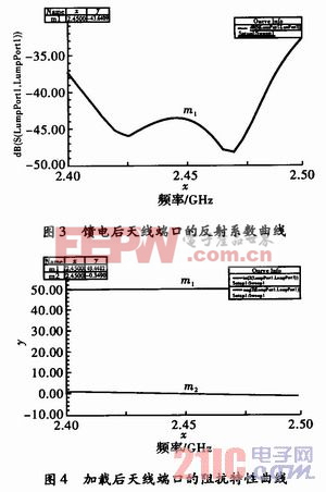 天线单元加馈电后行进了仿真得出了单元天线在工作带宽内的端口反射系数和阻抗特性,分别得到如图3和图4的结果。图3可以看出加馈电后天线端口的反射系数在工作频段内均-30 dB,对应驻波1.06。图4可以看出加馈电后天线在中心频率上的输入阻抗为49.4-j0.35 。
