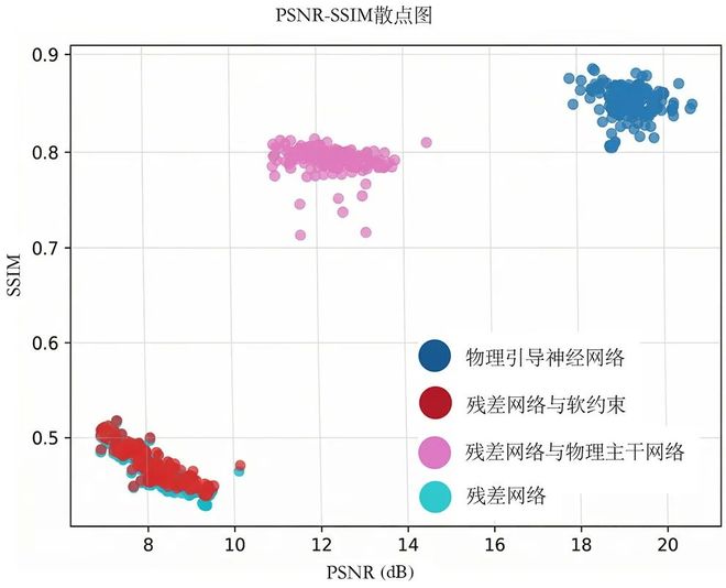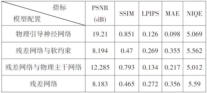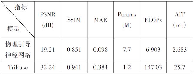 客观性能指标对比方面,TriFuse在通用视觉质量指标上呈现明显优势,这一差异源于 TriFuse 通过Transformer的长距离依赖建模与扩散模型的生成式去噪能力,能够更精准还原图像全局光照分布与结构一致性,在主观视觉感知的自然度与细节丰富度上表现更优;而物理引导神经网络则在像素级误差控制上实现了突破性优势,其平均绝对误差仅为TriFuse的1/4,这一核心优势得益于本文模型的物理引导机制,从底层限制了像素预测的偏差范围。