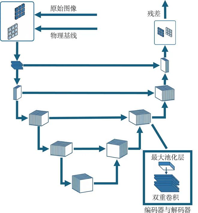 物理引导神经网络由带有可解释物理主干的全连接神经网络与基于U⁃Net架构的残差网络两部分构成,如图1所示。