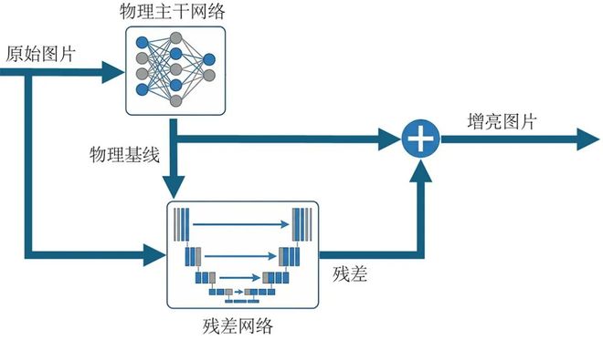 尽管上述代表性方法在不同维度推动了低照度增强的性能上限,但也揭示出当前研究仍存在的3方面问题:一是全局曝光校正与局部纹理复原难以兼顾;二是色彩一致性约束不足导致色偏与伪影;三是在追求效果时往往引入较高的计算开销。针对上述问题,本文提出的物理引导神经网络在结构上以轻量级全连接网络从整图统计特征预测可解释的全局曝光参数,先构建物理合理的亮度基线,再以带跳连的残差编解码器对局部高频细节进行受控补偿,以减少计算量与硬件消耗。