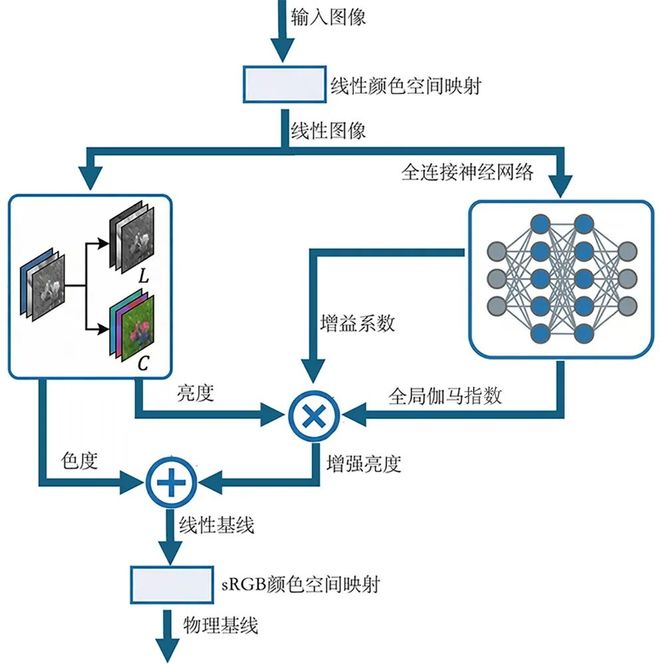 随后进入参数预测阶段。系统对处于线性颜色空间的图像执行全局平均池化(Global Average Pooling),提取全图的颜色与亮度统计特征向量。该向量被送入一个轻量级的全连接神经网络,并预测出与亮度计算相关的两个关键物理控制参数:全局伽马指数(幂律指数)与增益系数。为保证输出曲线符合物理规律,网络末端采用非线性激活函数与仿射变换,严格将全局伽马指数与增益系数约束在预设的合理曝光区间内,并通过额外的惩罚项防止参数越界。